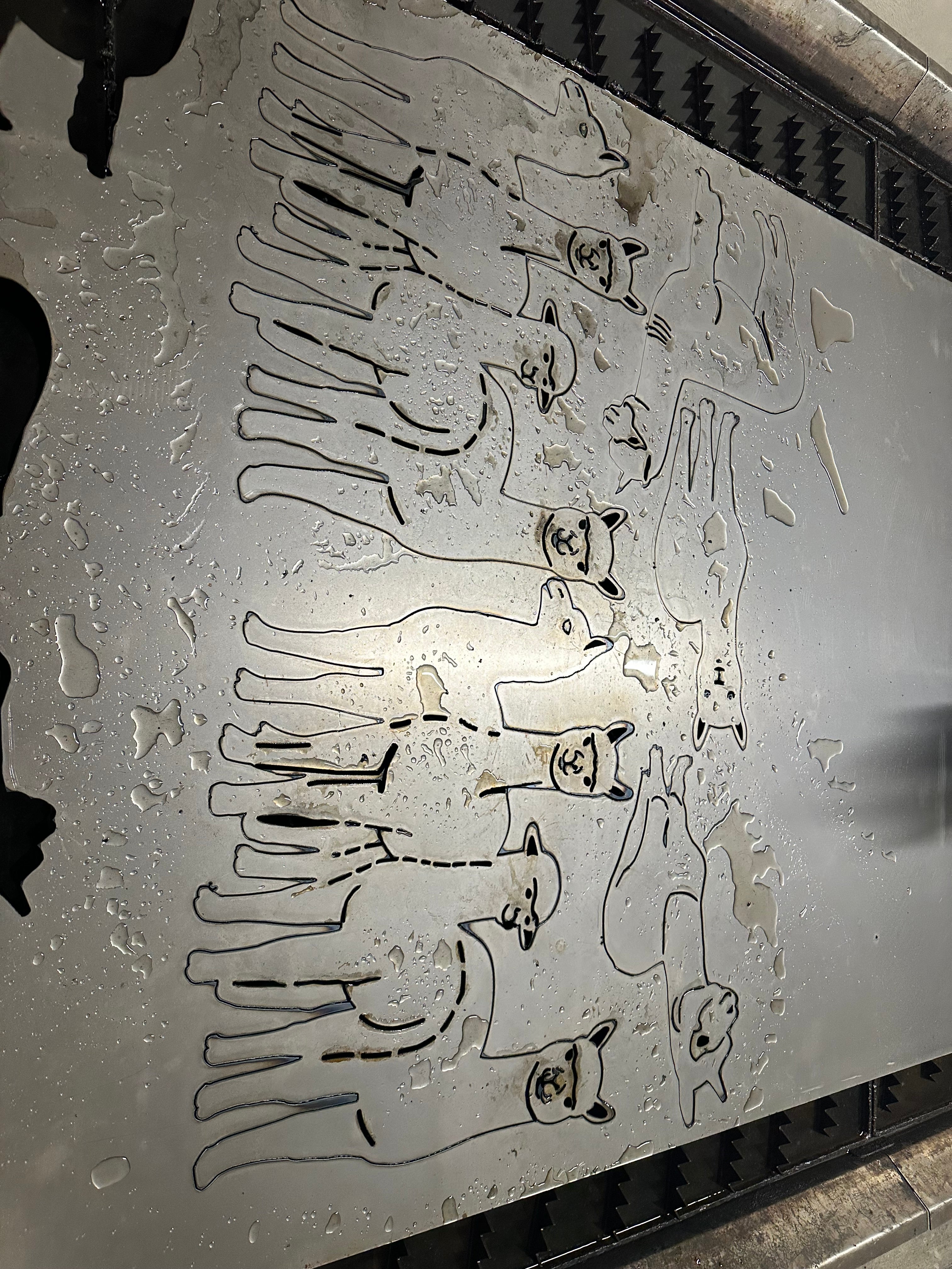 Anschließend wird das Motiv mit einer modernen Plasmaschneideanlage aus Metall herausgearbeitet. So entsteht eine detailreiche, ausdrucksstarke Silhouette, die den Charakter jedes Alpakas einfängt.